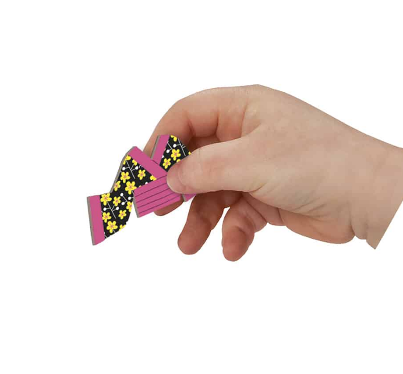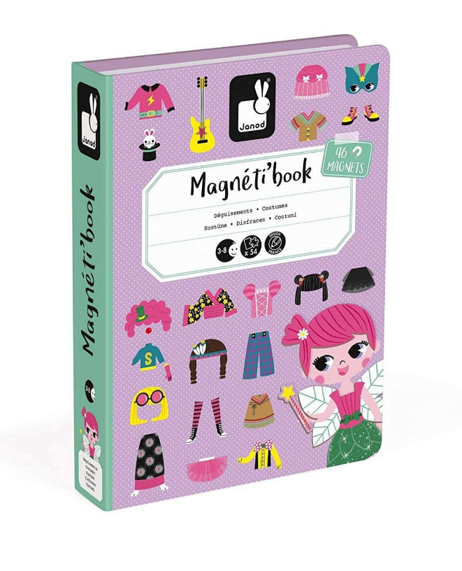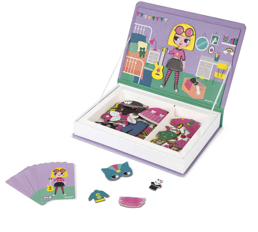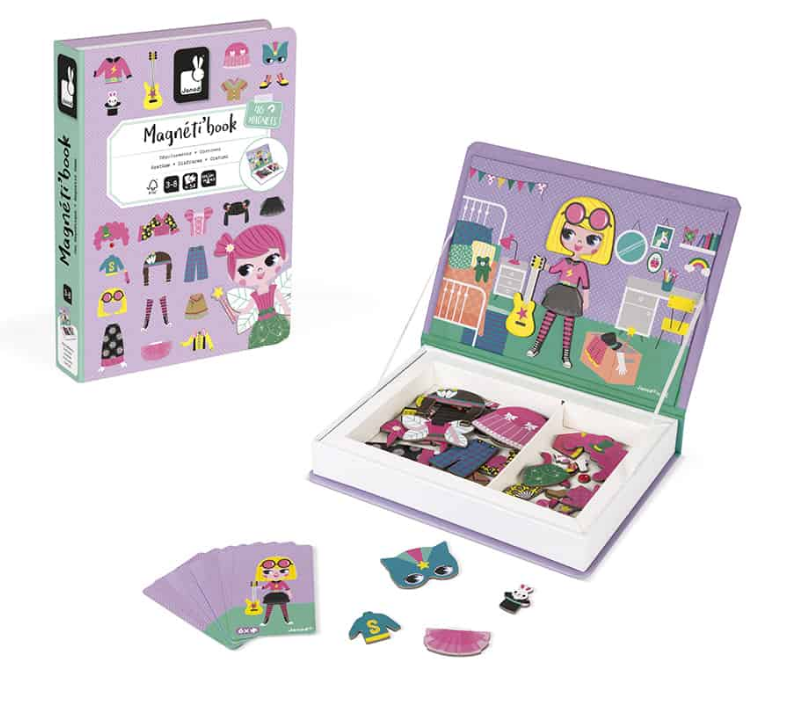 משחק חינוכי מגנטי בקרטון לבנות בנושא התלבושת. מורכב מ-46 מגנטים ו-8 קלפים. לאחר פתיחת הספר, המטרה היא ליצור על הבמה את אותה תלבושת כפי שמצוין על הכרטיס בזכות המגנטים.
